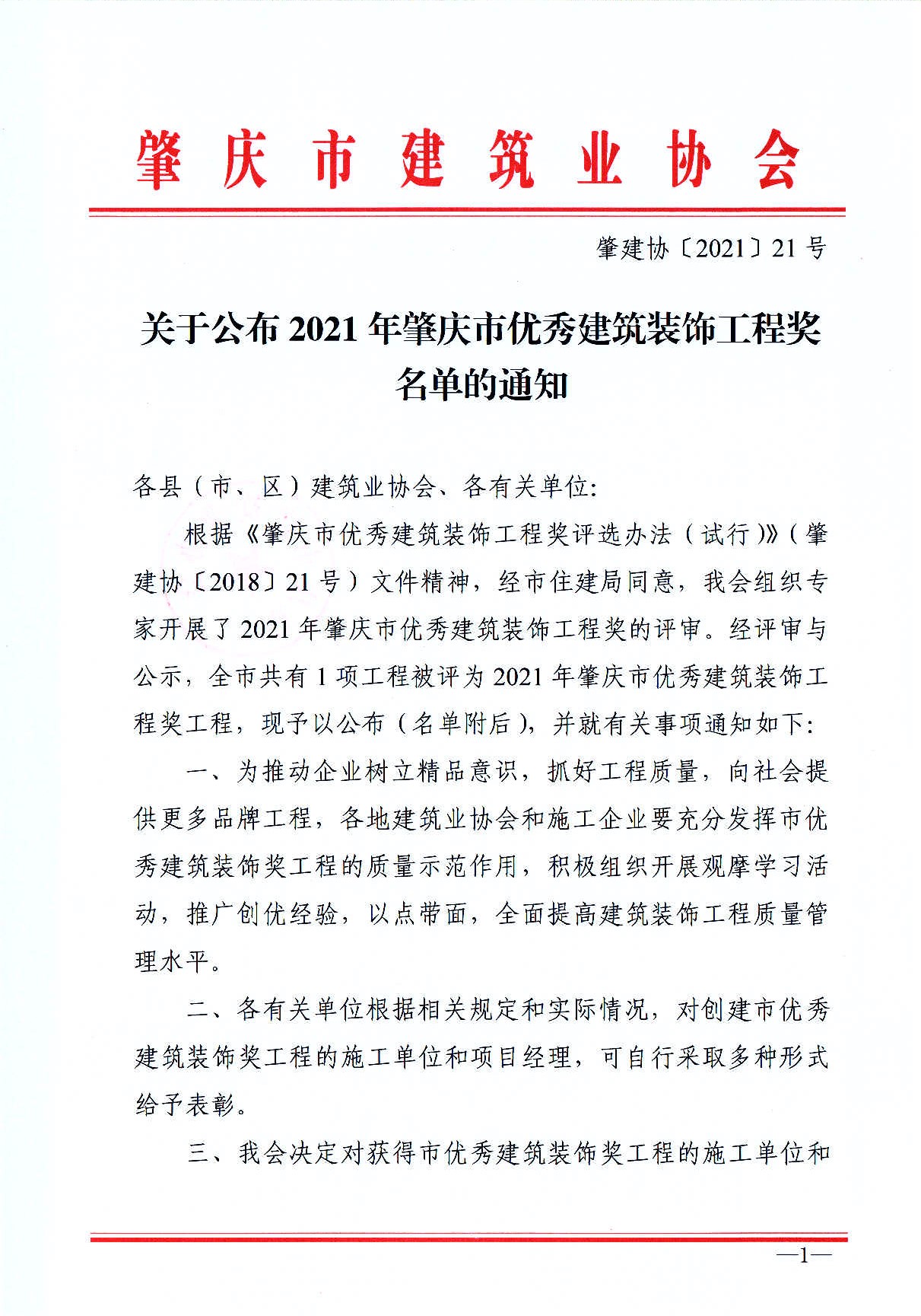 关于公布2021年肇庆市优秀建筑装饰工程奖名单的通知(1)
