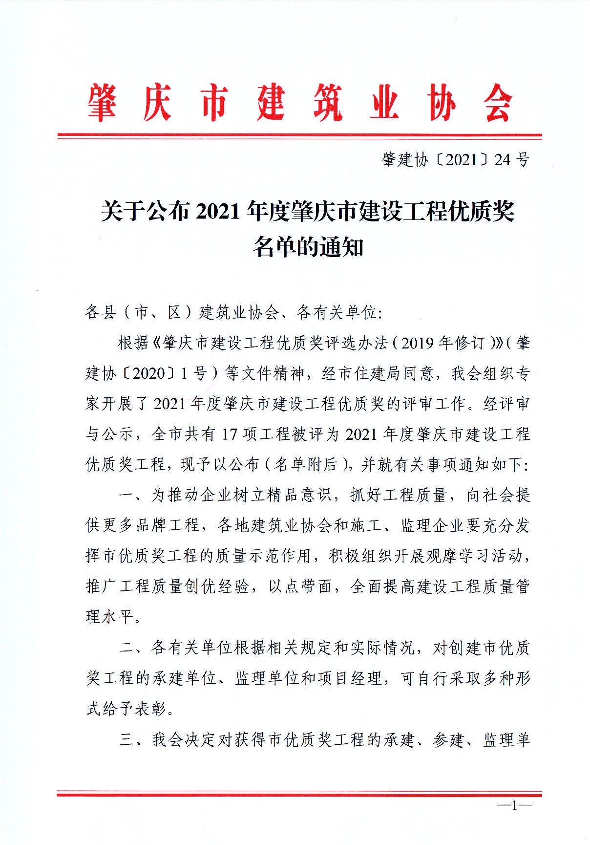 关于公布2021年度肇庆市建设工程优质奖名单的通知