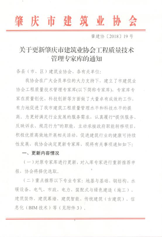 附件1:肇庆市建设工程质量技术管理专家汇总表.xlsx 附件2:肇庆市建设工程质量技术管理专家推荐表.doc 附件3:肇庆市建设工程质量技术管理专家专业分类表.doc 关于更新广东省建筑业协会工程质量技术管理专家库的通知.zip