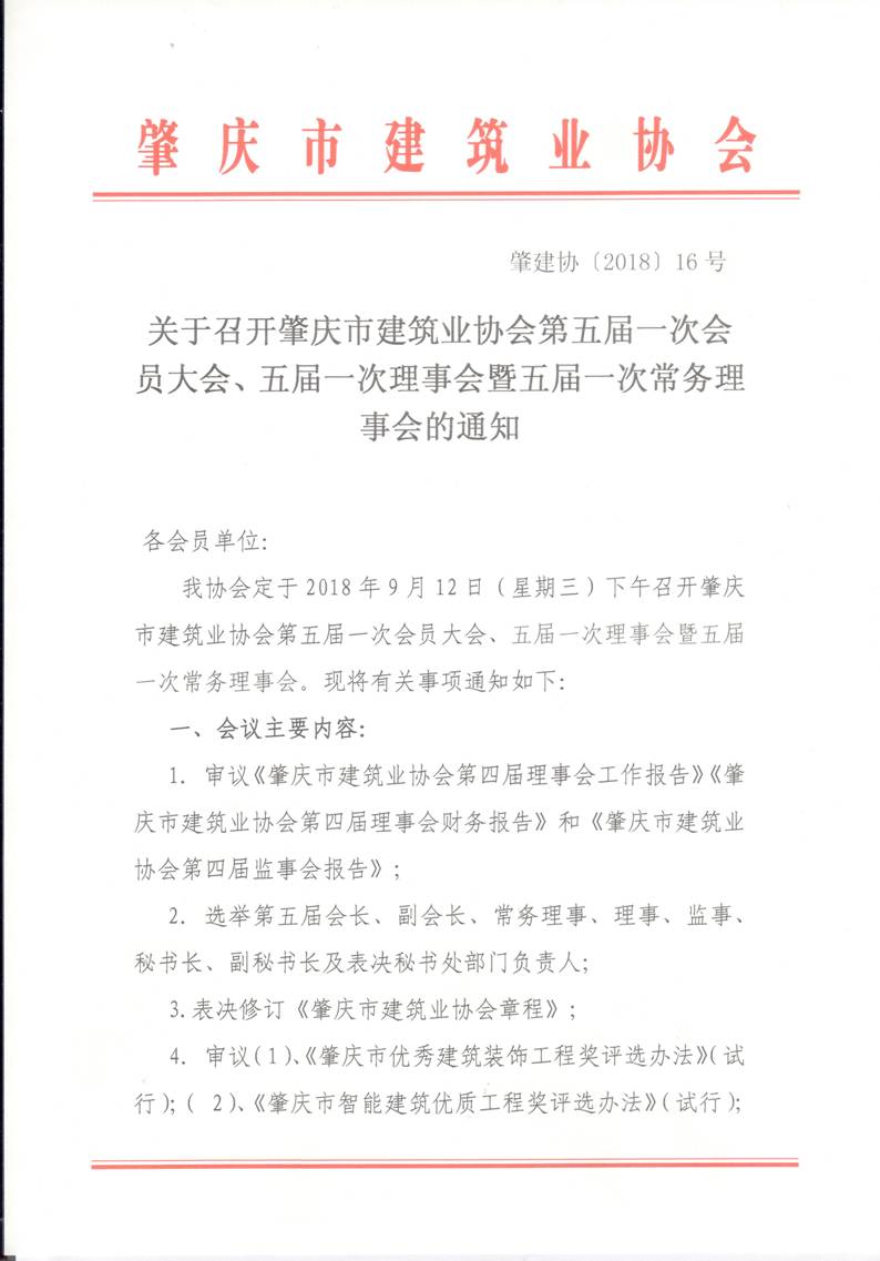关于召开肇庆市建筑业协会第五届一次会员大会、五届一次理事会暨五届一次常务理事会的通知