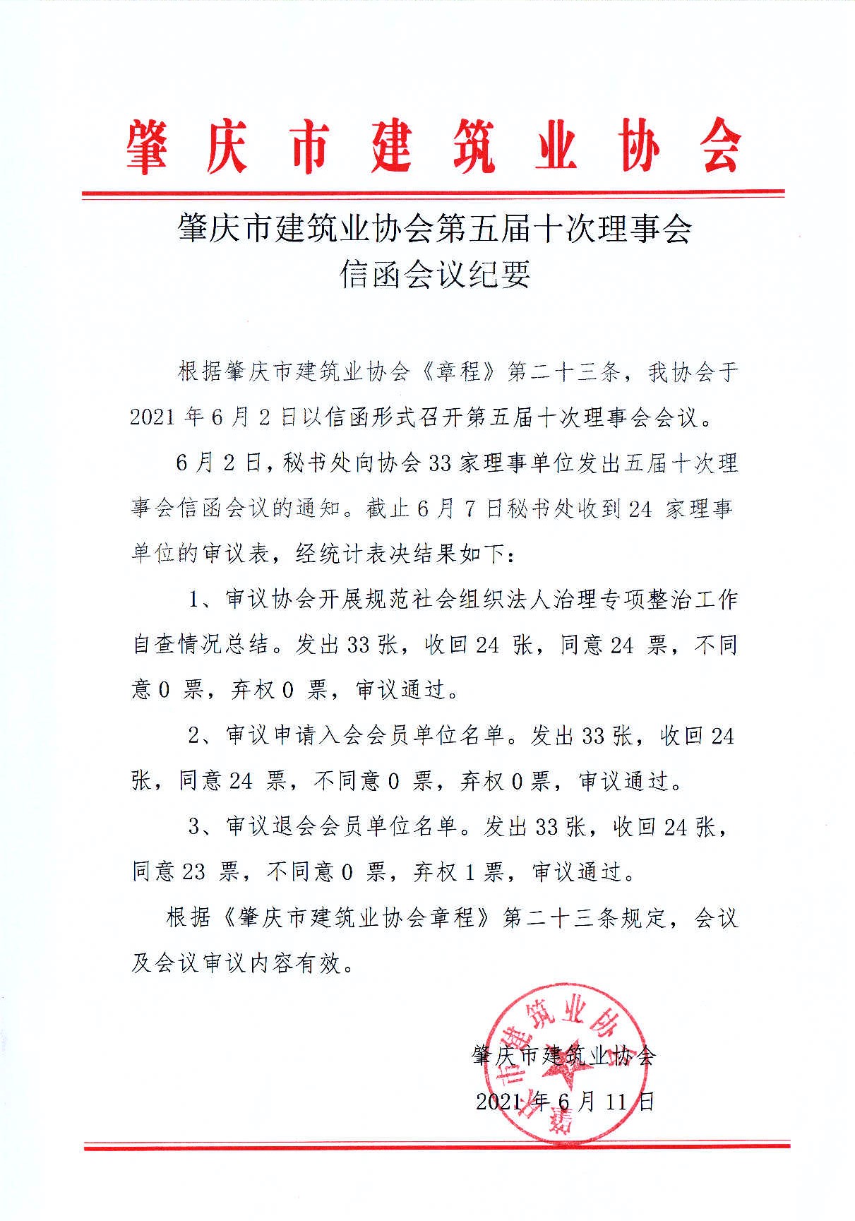 肇庆市建筑业协会第五届十次理事会信函会议纪要